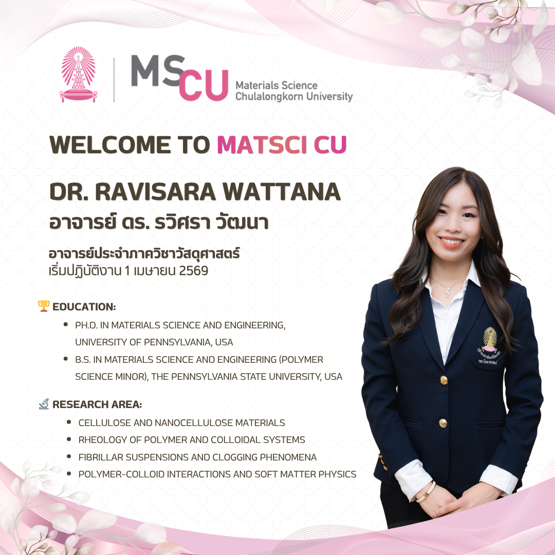 ภาควิชาวัสดุศาสตร์ ขอต้อนรับอาจารย์ใหม่ อาจารย์ ดร. รวิศรา วัฒนา อาจารย์ประจำภาควิชาวัสดุศาสตร์ คณะวิทยาศาสตร์ เริ่มปฏิบัติงานวันที่ 1 เมษายน 2569 ✨ 🎓 Education:– Ph.D. in Materials Science and Engineering, University of Pennsylvania, USA–