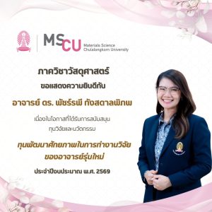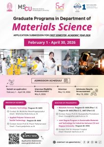 ประกาศรับสมัครนิสิตใหม่ ระดับบัณฑิตศึกษาภาควิชาวัสดุศาสตร์ คณะวิทยาศาสตร์ จุฬาลงกรณ์มหาวิทยาลัย ภาคการศึกษาต้น ปีการศึกษา 2569 รับสมัคร: 1 กุมภาพันธ์ – 30 เมษายน 2569 หลักสูตรที่เปิดรับสมัคร ระดับปริญญาโท (Master of Science)– สาขาวิชาเทคโนโลยีเซรามิก (รหัสหลักสูตร: 4603)– สาขาวิชาวิทยาศาสตร์พอลิเมอร์ประยุกต์และเทคโนโลยีสิ่งทอ (รหัสหลักสูตร: 4608) ระดับปริญญาเอก (Doctor of Philosophy)– สาขาวิชาวัสดุศาสตร์