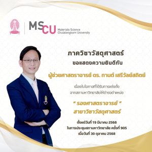 ภาควิชาวัสดุศาสตร์ ขอแสดงความยินดีกับ ผู้ช่วยศาสตราจารย์ ดร.กานต์ เสรีวัลย์สถิตย์ เนื่องในโอกาสที่สภามหาวิทยาลัยมีมติให้ดำรงตำแหน่ง รองศาสตราจารย์ ในสาขาวิชาวัสดุศาสตร์ ตั้งแต่วันที่ 19 มีนาคม 2568 #MatSciCU